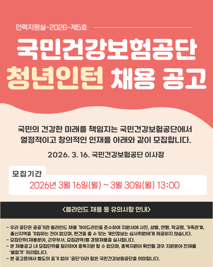°ø°í¡¤Á¢¼ö ¡¯26.3.16.(¿ù) ~ 3.30.(¿ù) 13:00 °ø´Ü ȨÆäÀÌÁö(www.nhis.or.kr)> ±¹¹Î¼ÒÅ롤Âü¿©>